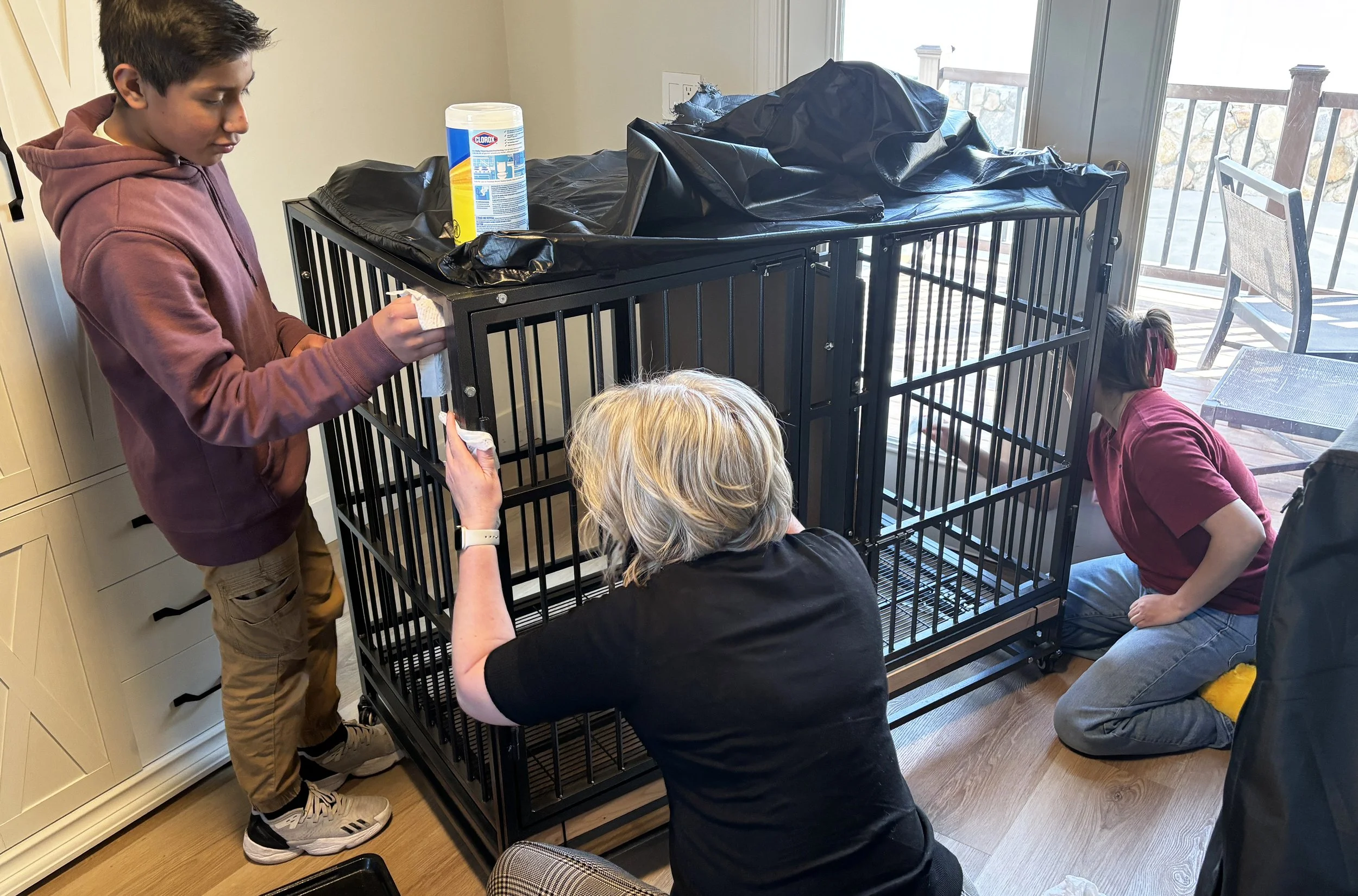 Troy, Mom, Veidi cleaning dog crates