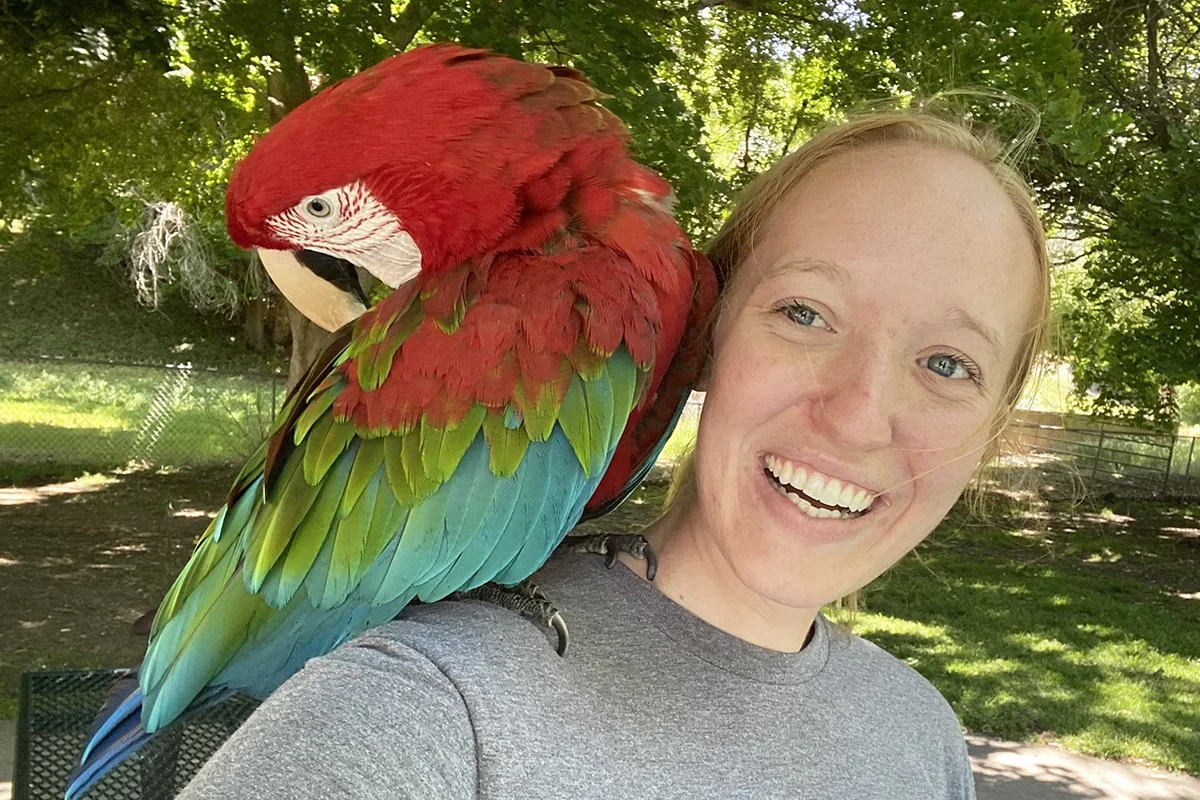 After work one day, I went to a park to start my run and saw an old man sitting at a table…with a beautiful bird perched on his shoulder! I walked up to him and started talking and he let the bird come over and hang out on my shoulder for a minute! He was such a nice man, and I could tell that he really loved and took care of his bird, King.