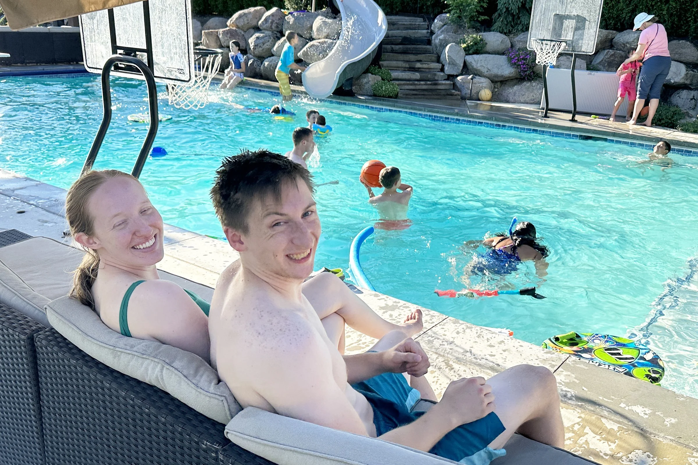 We had a party in Aunt Amy's backyard. Dad's side of the family came for this get-together. I mostly swam in the pool, because it was super relaxing.