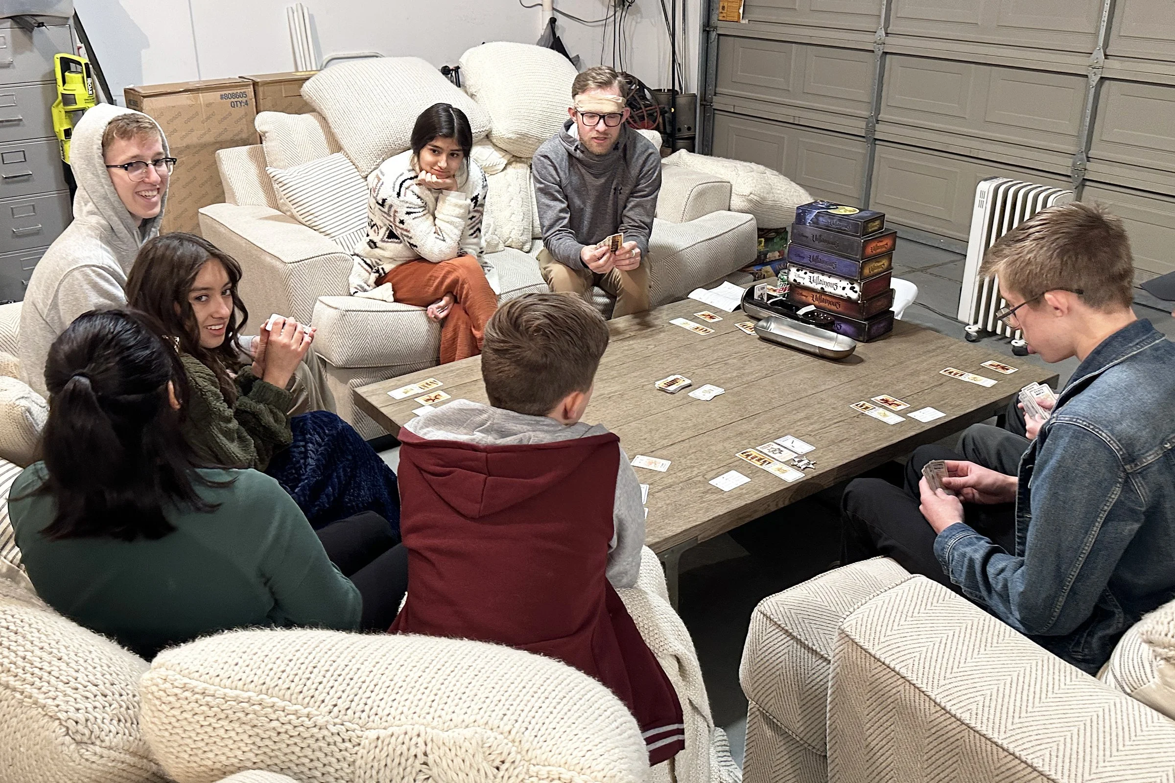 Then after dinner we sat on couches in the garage and played a game called Built with Kyle, and it was actually really fun. Then after that I went swimming and Aunt Amy turned on the movie Elemental on her projector in her backyard while some of us were still in the pool.