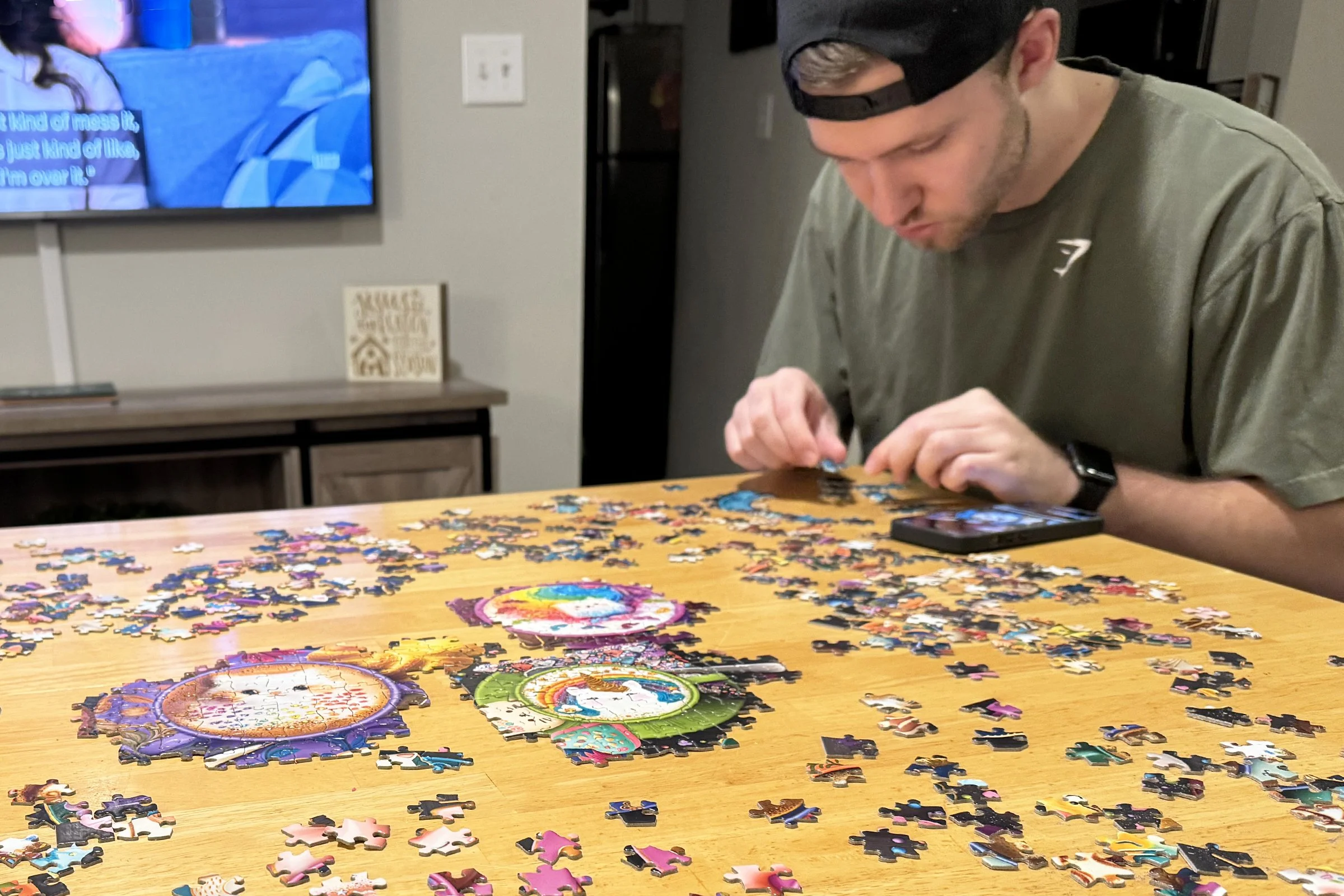 After we got home and put the girls to bed, Braden and I spent some time doing a puzzle. We’ve been working on it for the past week or so and haven’t really been able to use our kitchen table to eat because the puzzle is taking up all the space. But we finally finished, only to realize that we had lost one piece!