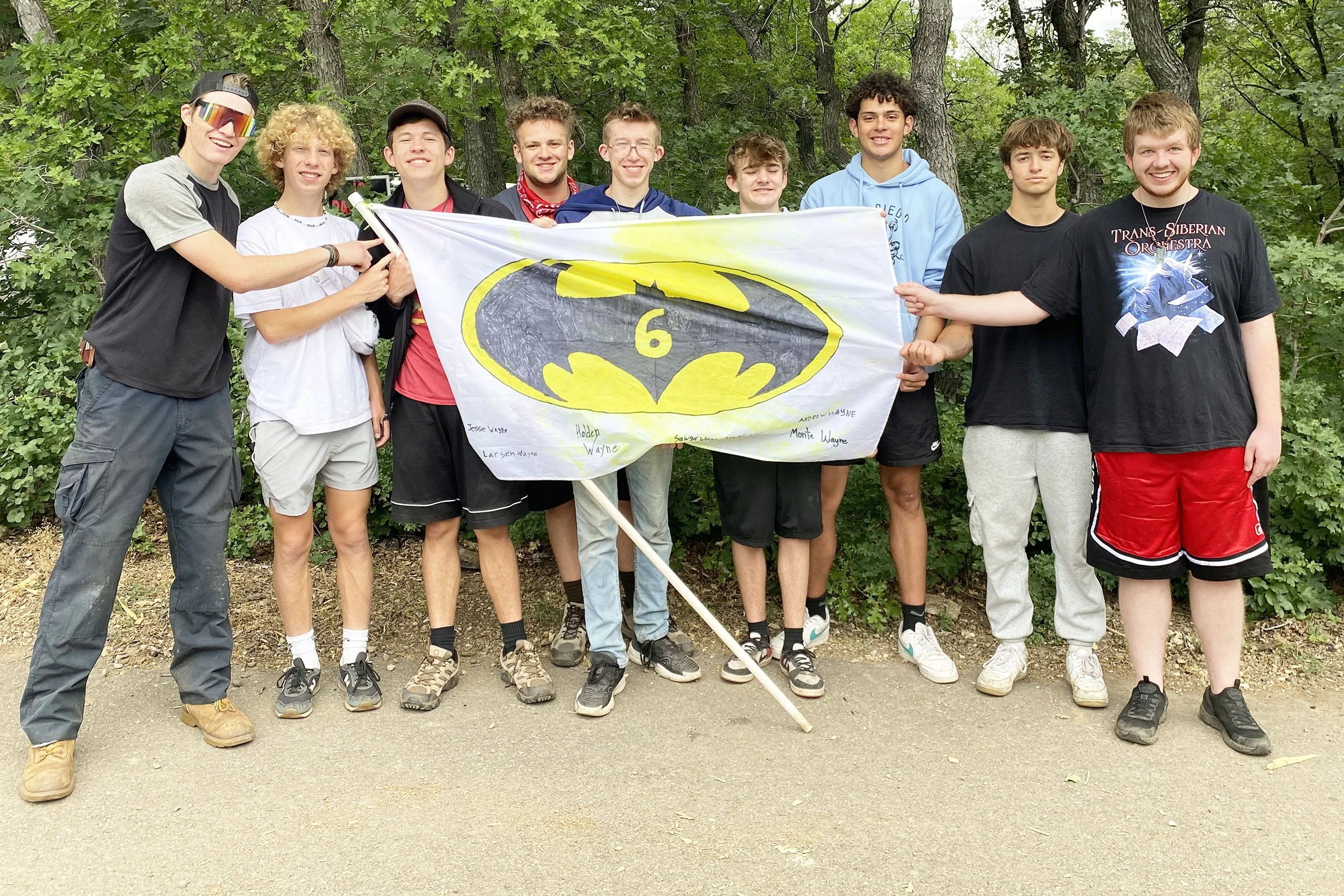 Also, each zone made its own flag. In my zone, Jonas threw out the idea of a Batman-themed flag, so we drew a large Batman logo with a six in the middle. We wrote all of our names at the bottom, but instead of real last names, we replaced them all with Wayne. Our motto was, “We are vengeance, we are disciples of Christ, we are children of God… We are Batman!”