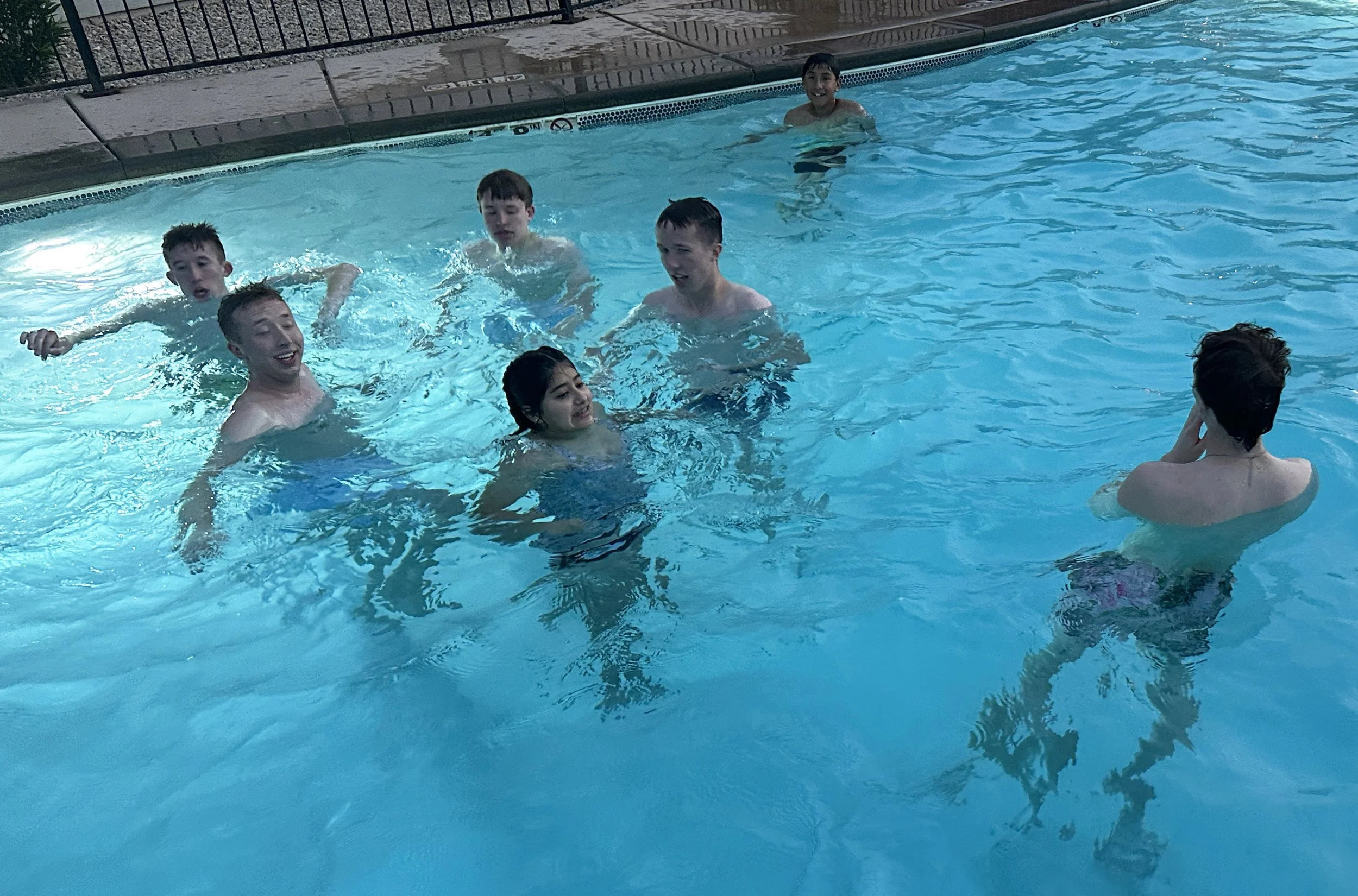Afterwards, we went to eat pizza, and the pizzas were ginormous. Then we went back to the house, got in our swimsuits, and went swimming. We played Infection Shark and Stuck in the Mud. Then we got in the hot tub.