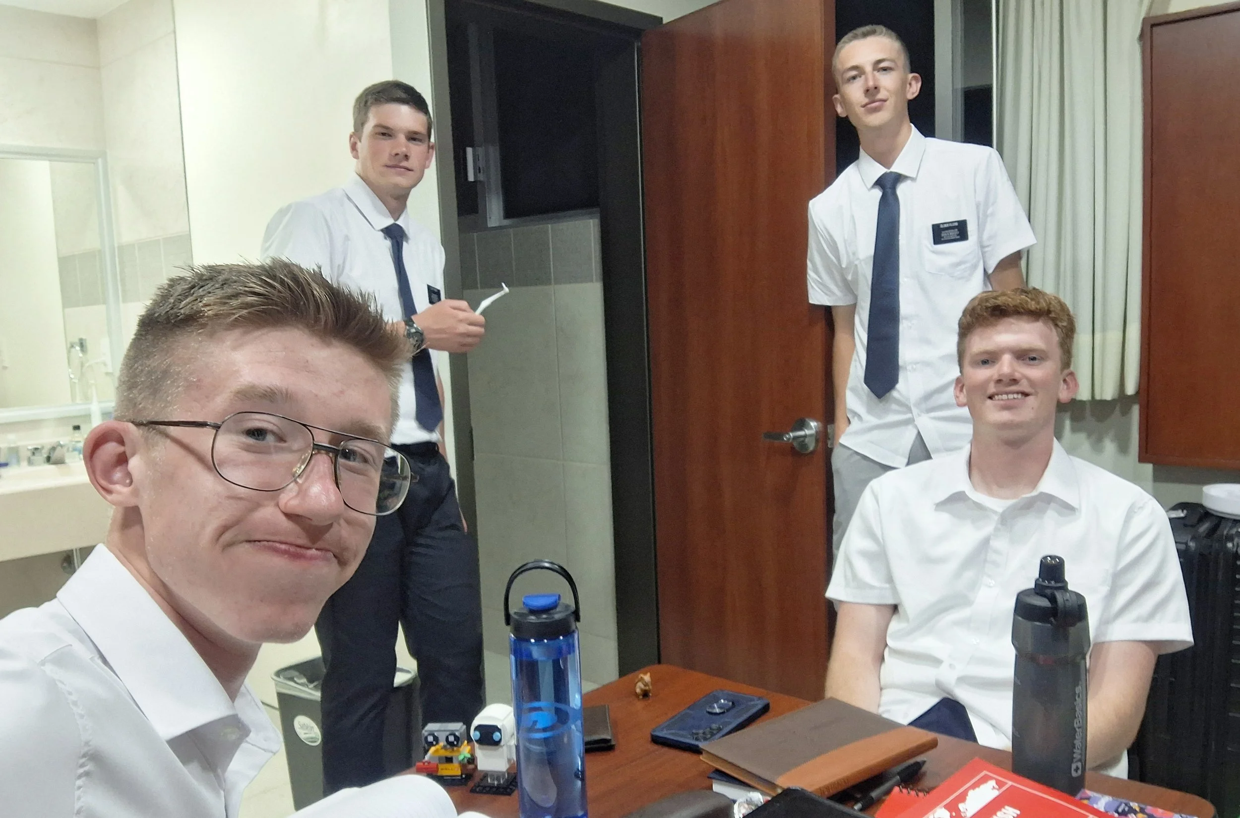 The flight was chill, and when we landed, everything went smoothly. Once we got outside to the bus, the heat hit us—but I genuinely love it. Then we met Élder Carter. We call him Élder Bicípulo. He’s a disciple of Christ—discípulo—and he has massive biceps, so we combined the words.